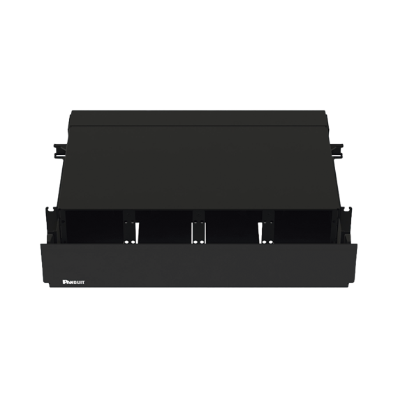 El gabinete para montaje en rack Opticom® de Panduit® garantiza la confiabilidad de la red al alojar, organizar, administrar y proteger hasta 192 terminaciones, empalmes, conectores y cables de conexión de fibra óptica. El FRE2U es de color negro, está hecho de acero y cuenta con 8 ranuras para casetes/FAP. Puede alojar 8 paneles adaptadores FAP, 8 casetes Opticom, 16 casetes HD Flex o módulos de empalme FOSM en un espacio de 2 RU. Se puede acceder fácilmente a las fibras a través de cajones extraíbles delanteros y traseros.