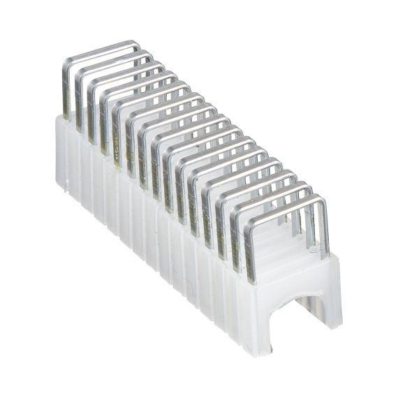 - Grapas que aseguran cables planos y redondos de voz, datos y video, y cables no metálicos forrados.