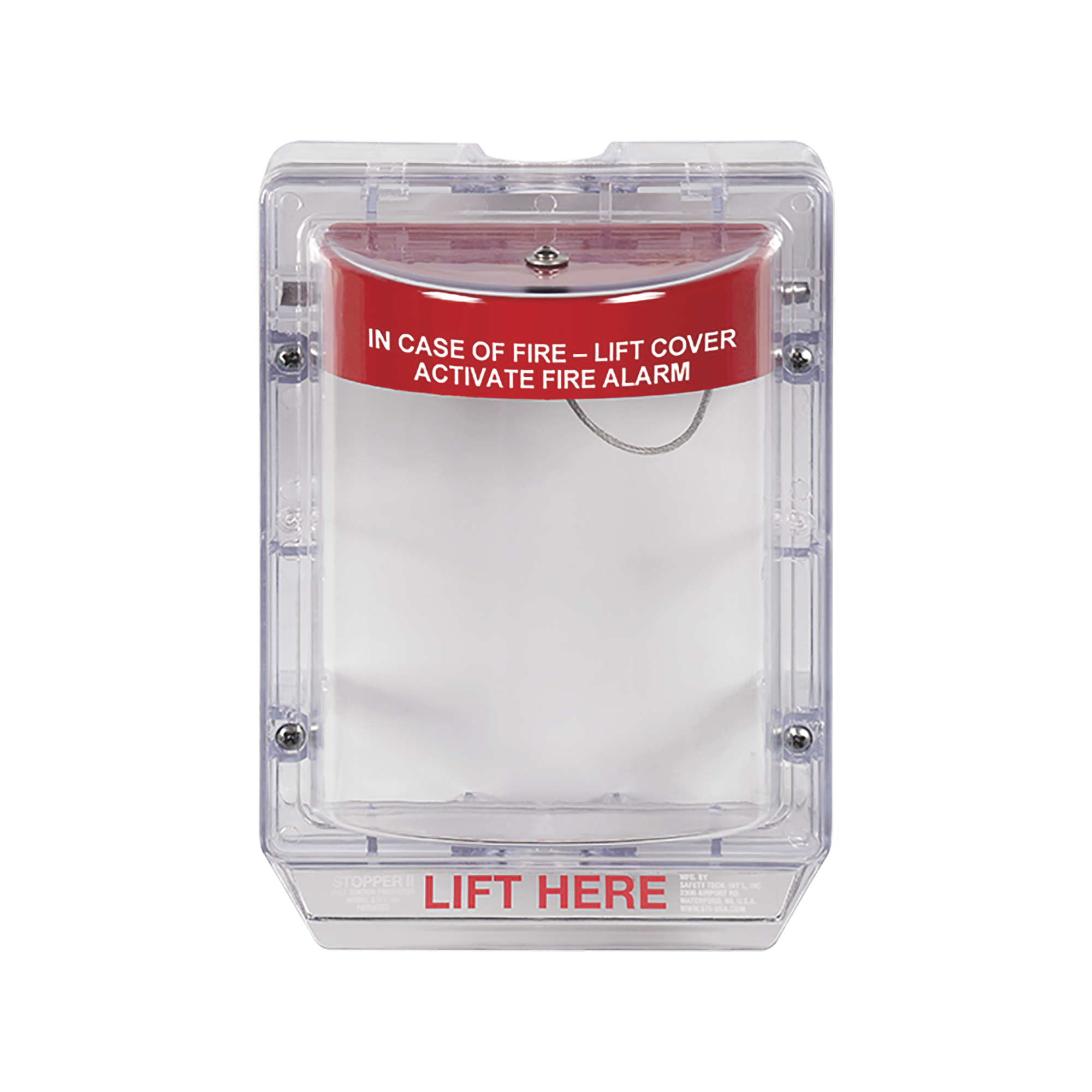 STI-1230 es una clara prueba de manipulaciones, la cubierta exterior resistente en policarbonato, con la leyenda, 'EN CASO DE FUEGO' que se coloca sobre la mayoría de las estaciones manuales. La cubierta está conectada al bastidor por un cable. Cuando se levanta la tapa, que cuelga de la estructura se podrá tener acceso al sistema de accionamiento de alarma.