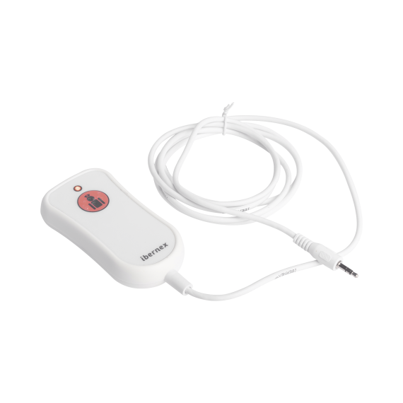 Pulsador de cama con conector mini jack y teclado de membrana para proporcionar mayor protección contra salpicaduras de agua. Se enchufa directamente en uno de los 2 conectores correspondientes del terminal de habitación.