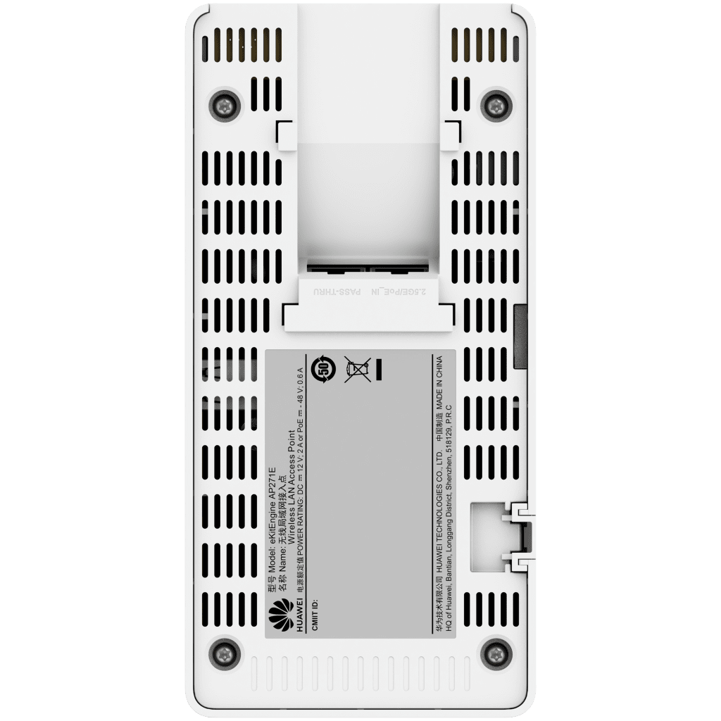 El Huawei eKitEngine AP271E es un punto de acceso (AP) de pared delgado para interiores que cumple con el último estándar Wi-Fi 7 (802.11be). Es compatible con las nuevas tecnologías Wi-Fi 7, como la operación multienlace (MLO) para agregación de enlaces, la tecnología multiusuario de múltiples entradas y múltiples salidas (MU-MIMO), el ancho de canal Wi-Fi 7 de 160 MHz y la modulación de amplitud en cuadratura (QAM) de 4096 MHz.