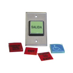 • Botón de salida versátil. • Placas seleccionables con mensaje y una con símbolo para discapacitados: Presione para salir, Salir, en español e inglés y símbolo para Discapacitados. • Placa de acero inoxidable.