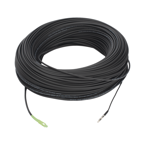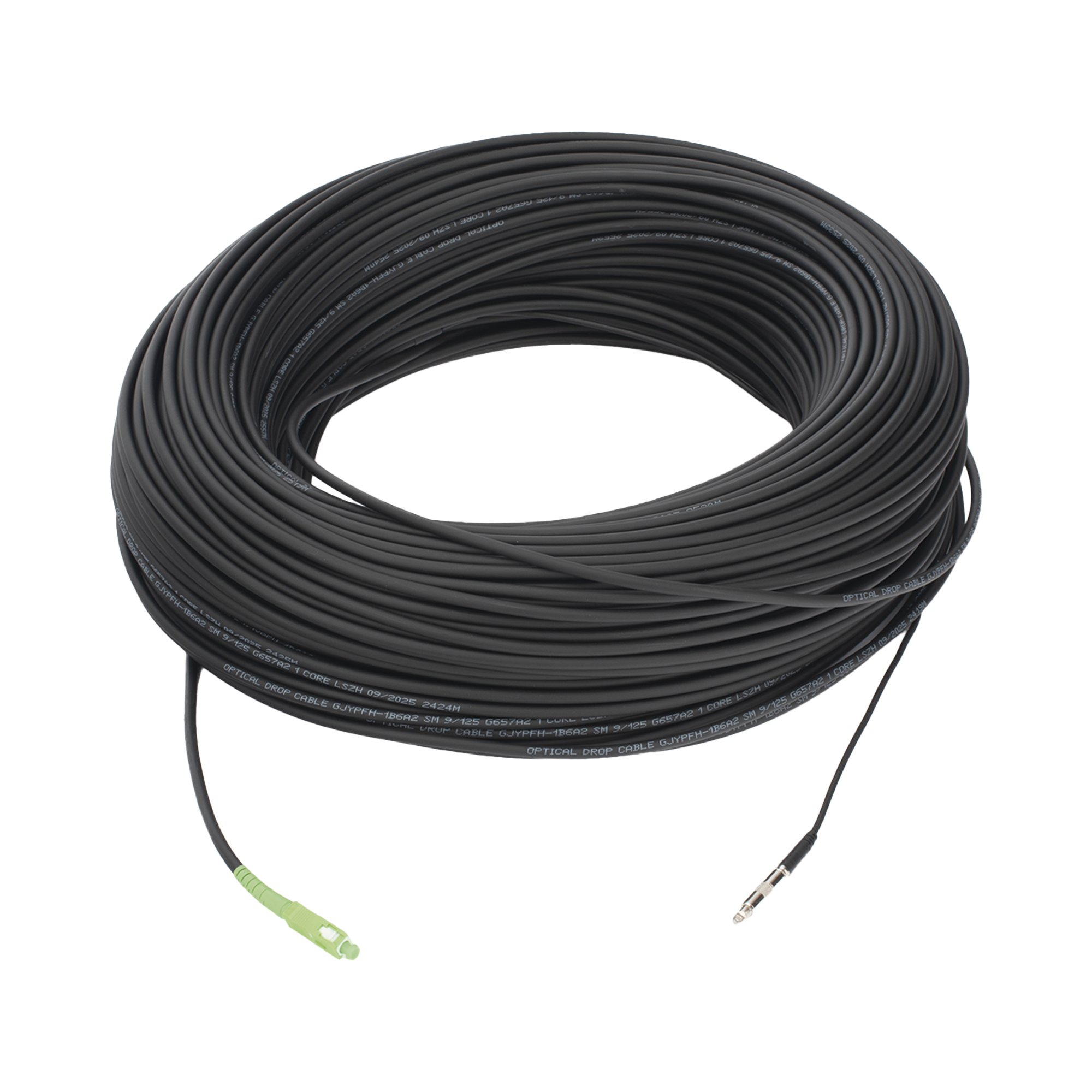 Rollo de Fibra Óptica Drop Redonda G657A2 Monomodo Simplex de 200 Metros con Conectores SC/APC-SC/APC para Instalaciones Aéreas, Subterráneas o a la Intemperie LP-200-SCA