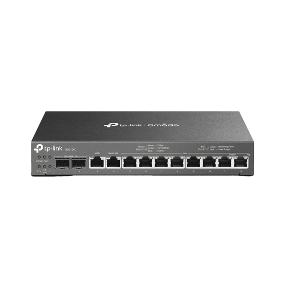 Router Omada VPN / SDN Multi-WAN 1G / Switch con PoE y Controlador / 2 puerto WAN/LAN SFP 1G / 1 Puerto RJ45 WAN / 1 Puerto WAN/LAN RJ45 / 8 Puertos PoE+ LAN RJ45 / 24,980 Sesiones Concurrentes ER7212PC