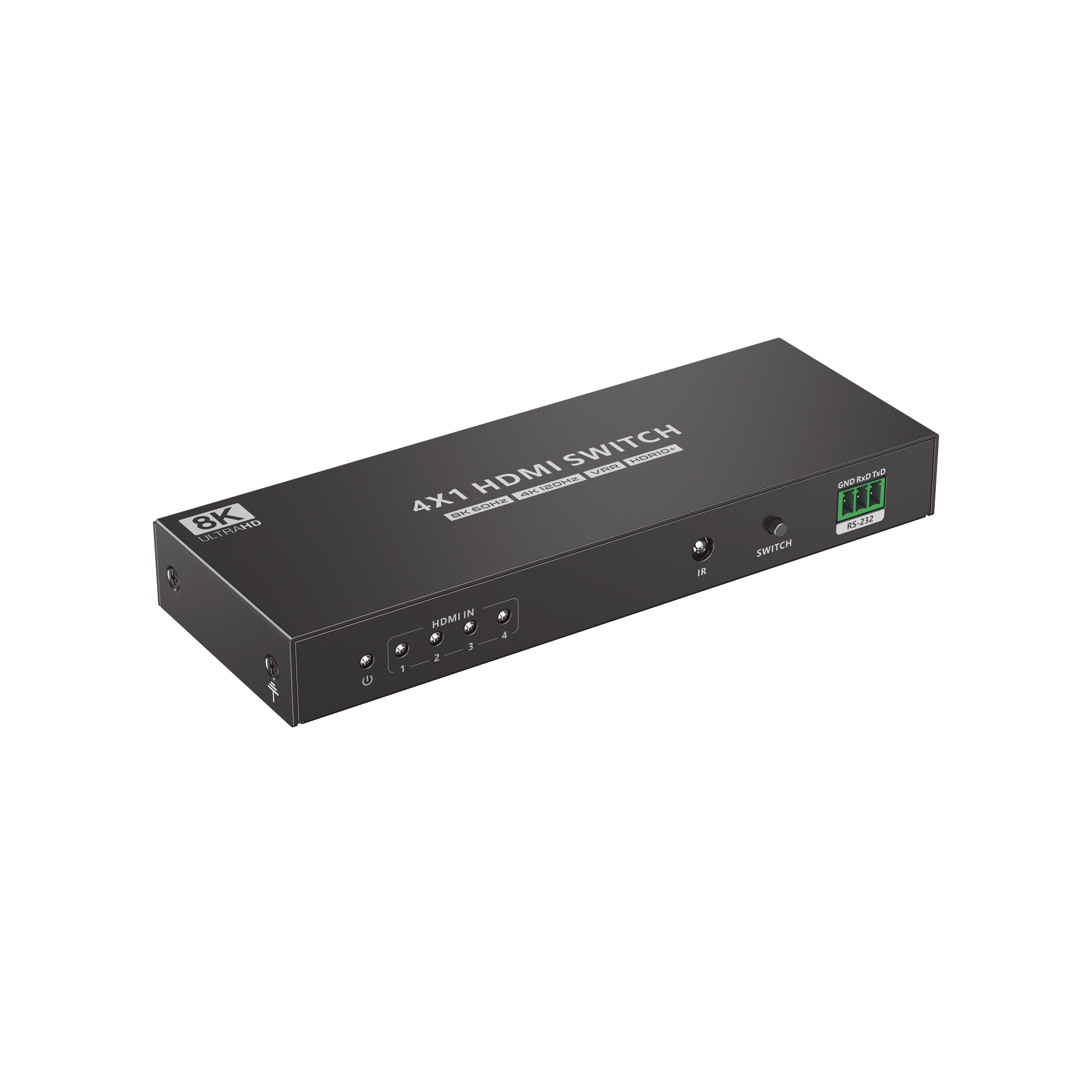 Es un dispositivo que permite conectar hasta 4 fuentes de señal HDMI a una pantalla, como por ejemplo televisores o monitores. Este conmutador es capaz de admitir una resolución máxima de 8K@60Hz y también es compatible con resoluciones más bajas. El conmutador ofrece diferentes métodos de control, como un control remoto por infrarrojos y un interruptor RS-232. Estos métodos permiten cambiar fácilmente entre las 4 fuentes de señal HDMI y seleccionar el contenido que se mostrará en la pantalla. Este producto se utiliza en diferentes aplicaciones, como el monitoreo de seguridad, el entretenimiento multimedia, la radiodifusión y los centros de mando.