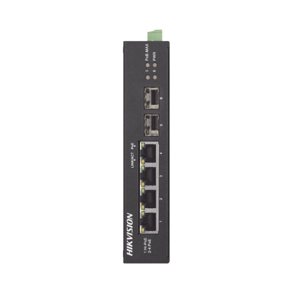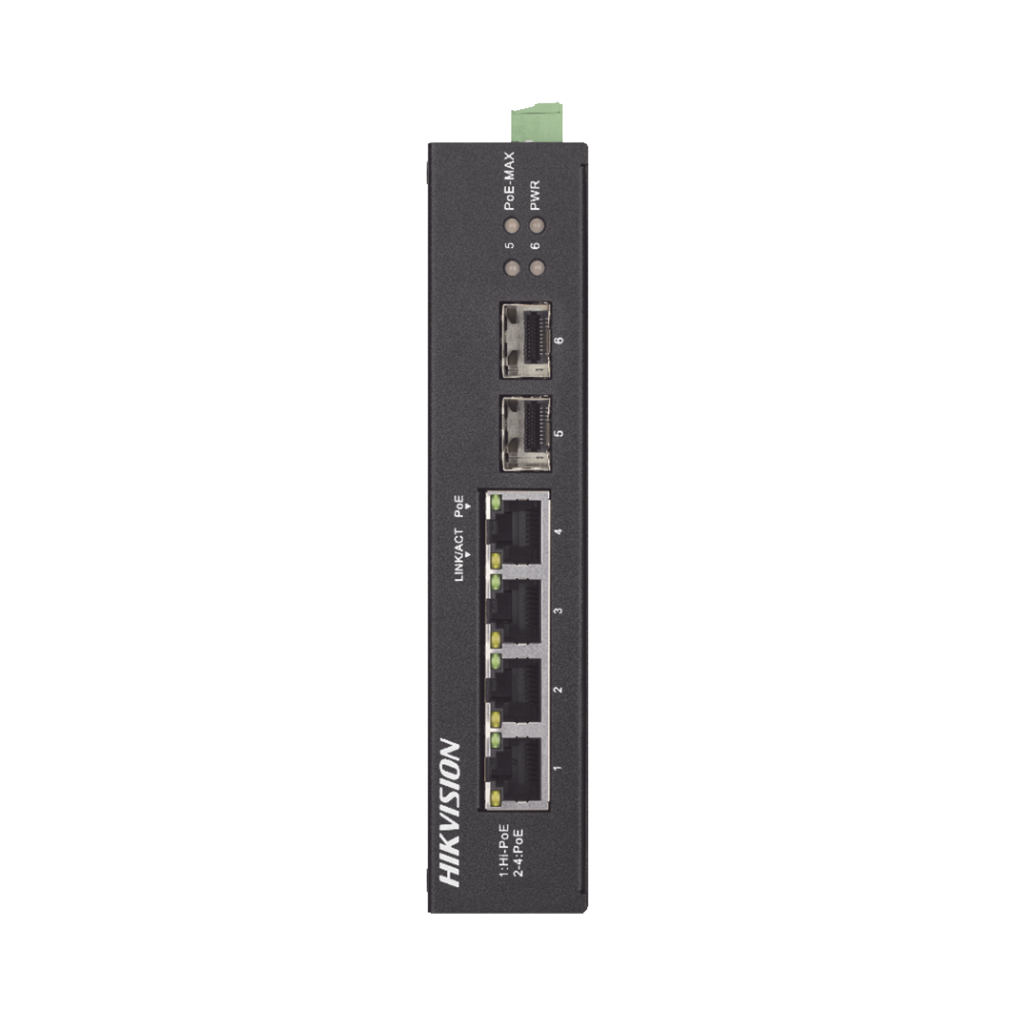 Switch Industrial No Administrable Gigabit / 3 Puertos Gigabit PoE+ (30 W) + 1 Puerto Gigabit PoE++ (60 W) / 2 Puertos SFP / 65 W Total / 48 a 57 VCD / Ideal para Proyectos / 300 Metros de Distancia DS-3T0506HP-E/HS
