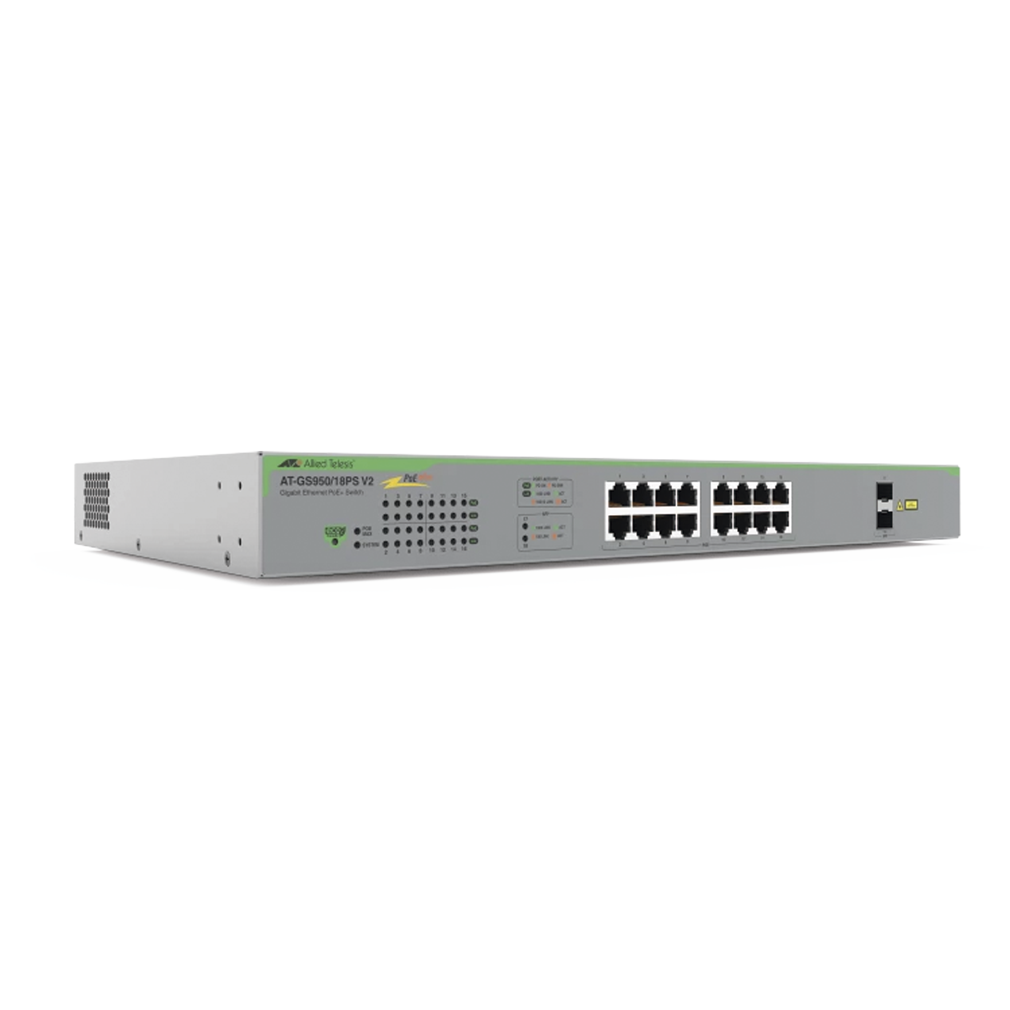El conmutador WebSmart Allied Telesis GS950/18PS V2 Gigabit PoE+ cuenta con 16 puertos 10/100/1000T y dos puertos SFP, que ofrecen hasta 30 watts por puerto (PoE+) para admitir cámaras de videovigilancia, puntos de acceso inalámbricos, teléfonos IP y otros dispositivos alimentados por PoE. PoE+ elimina la necesidad de cableado de energía separado y minimiza el desorden de fuentes de alimentación y adaptadores para una implementación simplificada.
