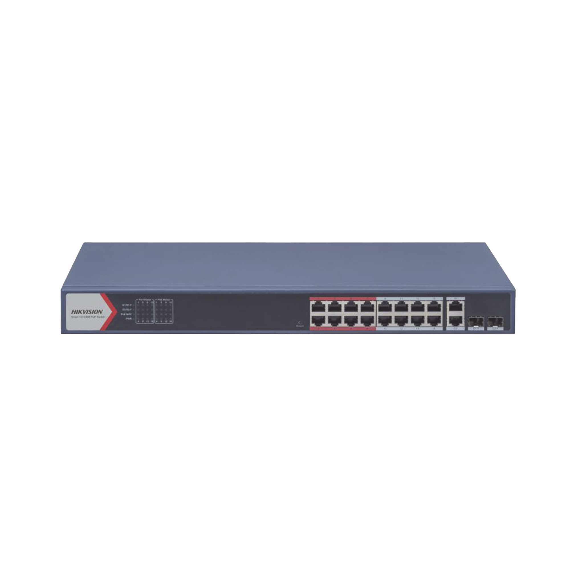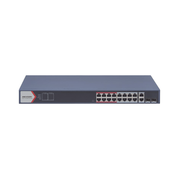 Switch PoE+ / Monitoreable / 16 puertos 10/100 Mbps PoE+ / 2 Puertos 1000 Mbps Uplink / 2 Puertos SFP de Uplink / Configuración Nube Hik-Partner Pro / Modo Extendido hasta 300 metros / 230 W DS-3E1318P-EI(B)