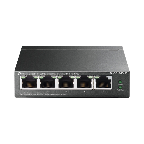 Switch PoE No Administrable de Escritorio / 5 puertos 10/100 Mbps / 4 puertos PoE af / Presupuesto 41 W / Modo extensor PoE hasta 250 metros / Calidad video prioritaria TLSF1005LP