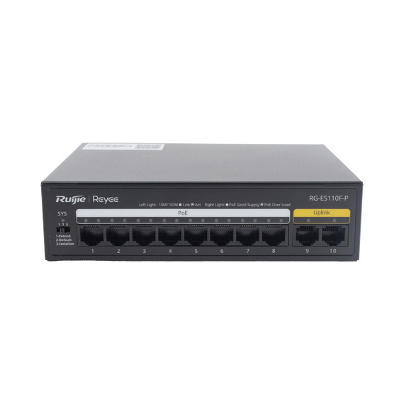 Switch PoE+ no Administrable, Hasta 110 Watts, 8 puertos PoE+ y 2 Uplinks 10/100 RG-ES110F-P
