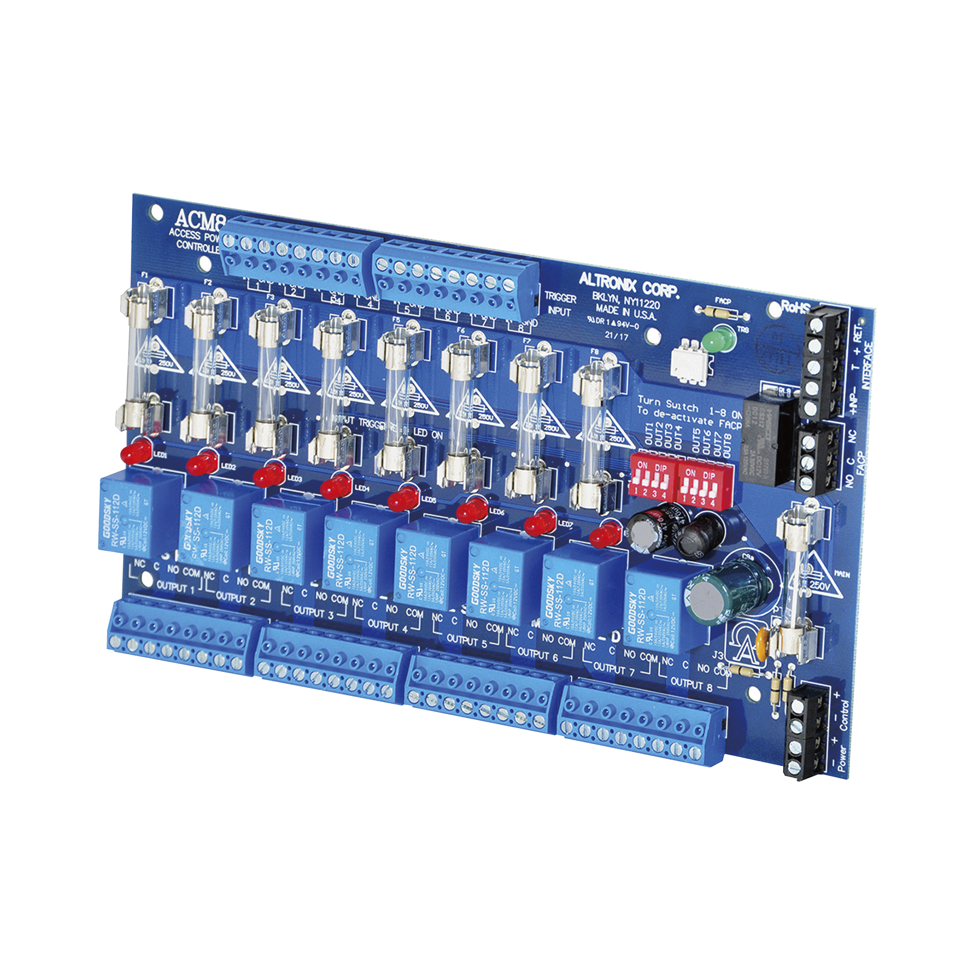 Altronix ACM8 convierte una (1) entrada de AC o DC de 12 a 24 voltios en ocho (8) independientemente salidas protegidas con fusible controlado. Estas salidas de potencia se pueden convertir a contactos secos tipo 'C'. Las salidas son activadas por un colector abierto o normalmente abierto (NO) con entrada de activador seco de un sistema de control de acceso, lector de tarjetas, teclado, pulsador, PIR, etc.