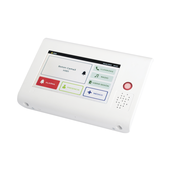 Posee una pantalla táctil de 7' desde la que se puede consultar y registrar la actividad del personal, así como gestionar llamadas y controlar los posibles canales de megafonía configurados. Además, gracias a su lector RFID integrado, el personal del centro puede identificarse mediante tarjeta para la gestión de alarmas y tareas.