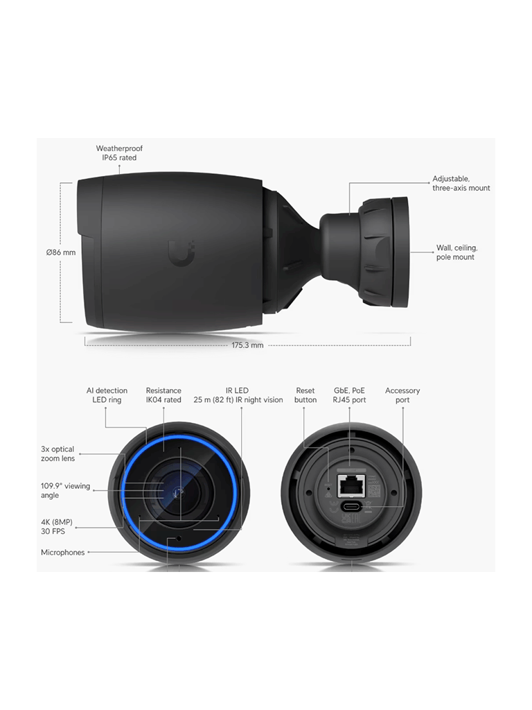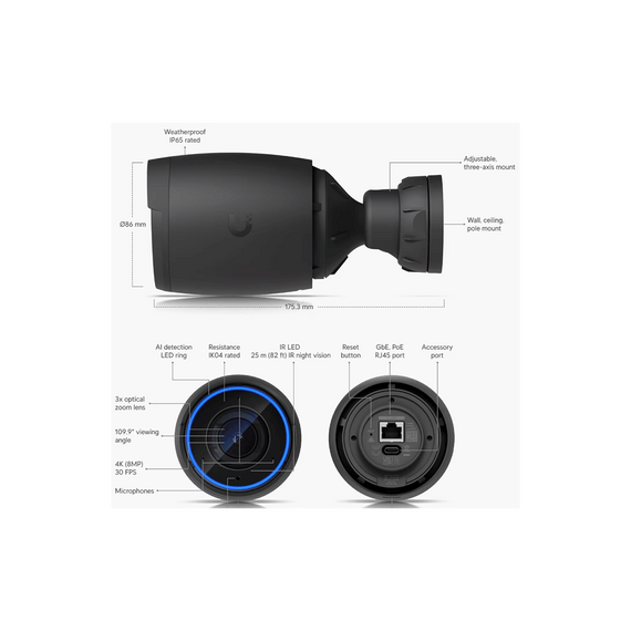UBIQUITI UVC-AI-PRO - Cámara 4K, Zoom óptico 3X, IA avanzada: detecta personas, lee matrículas , IR 25 metros , microfono integrado, audio bidireccional , Exterior/Interior, POE+ (Color Negro).