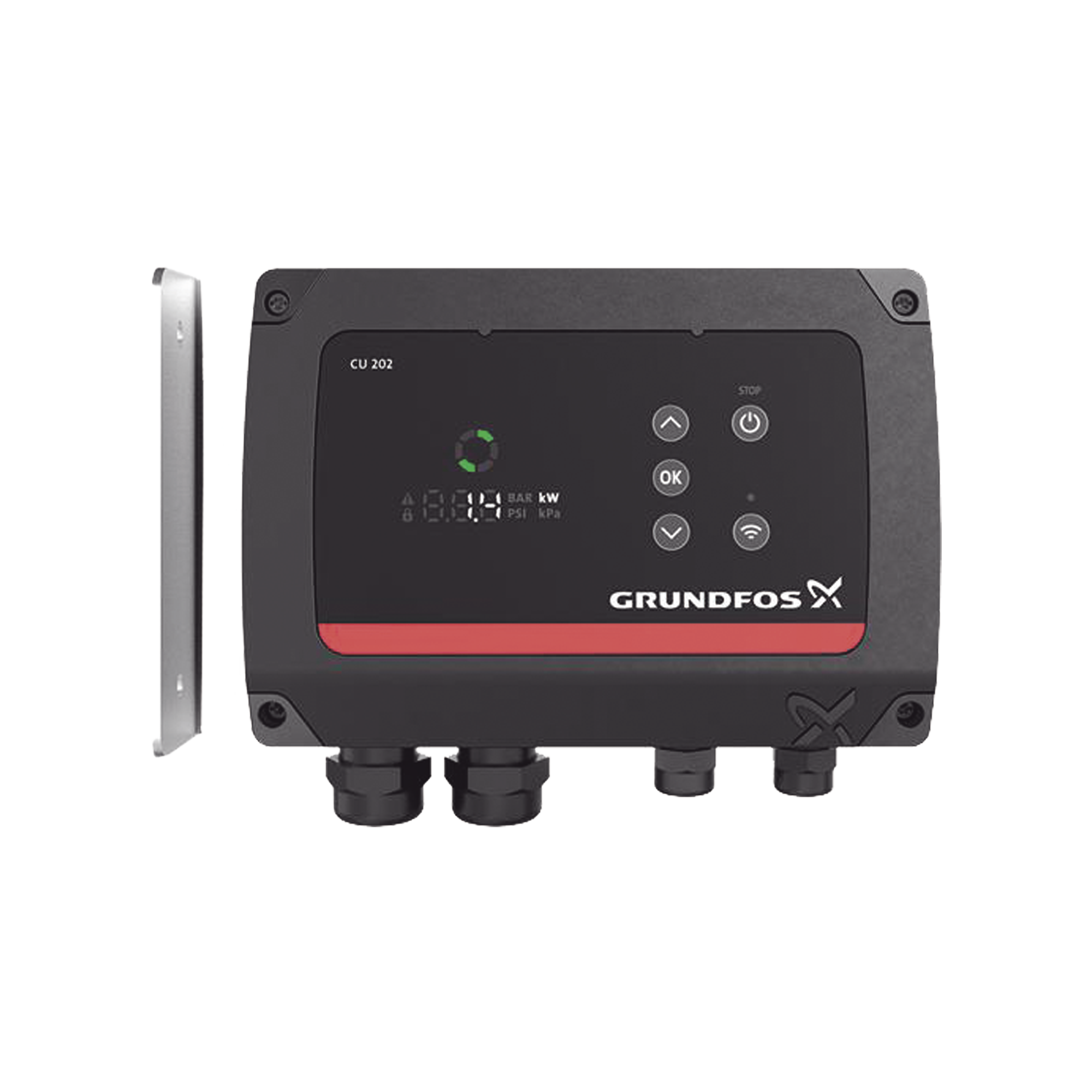 CU 202 incorpora entradas de cable para conexión de suministro de potencia, conexión de bomba, conexión de tierra y conexión de interruptor de nivel.