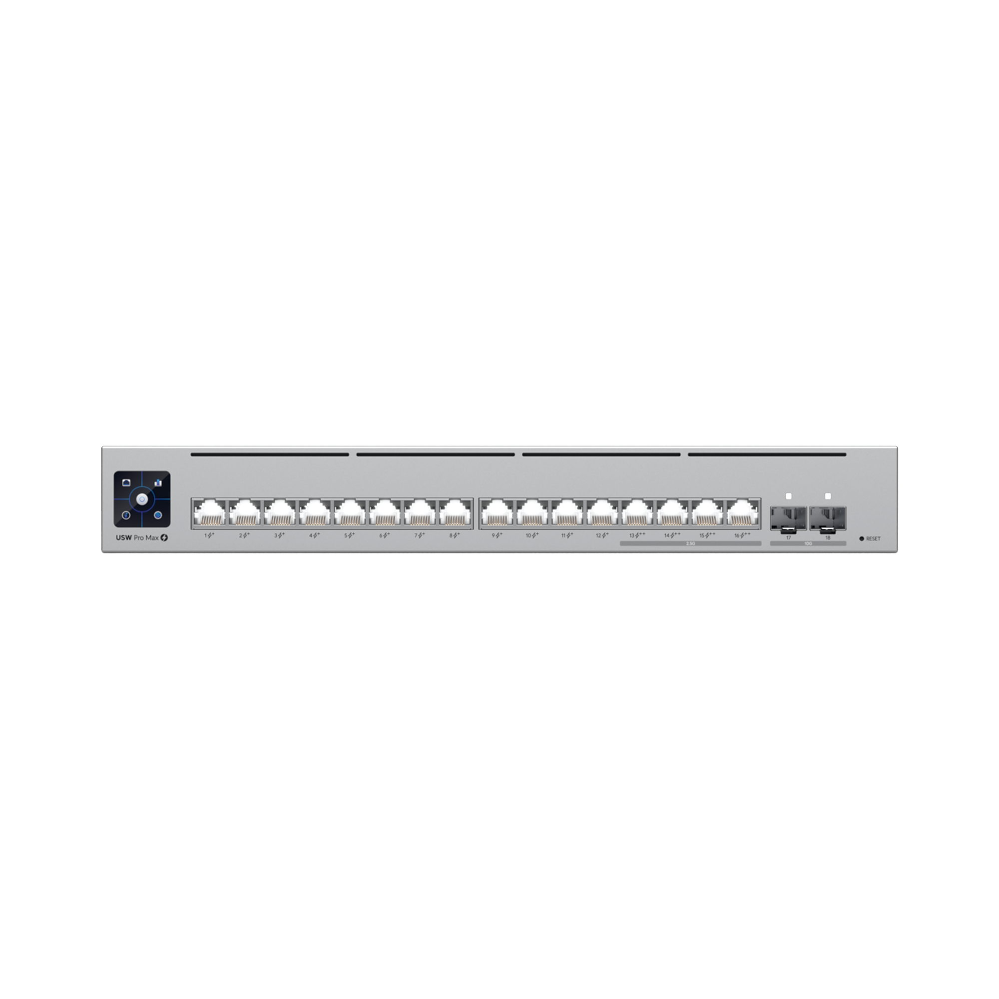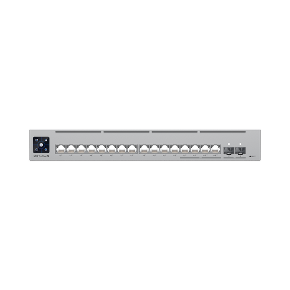 UniFi Switch Pro Max 16 con funciones Capa 3, 16 puertos EtherLight RGB / (4) puertos 2.5 GbE y (12) puertos GbE /(2) puertos SFP+ 10G /con pantalla táctil informativa USW-PRO-MAX-16